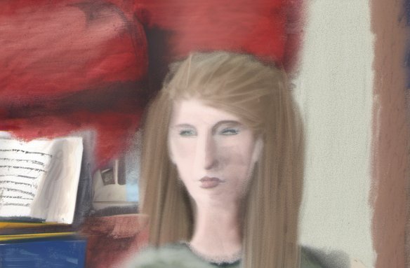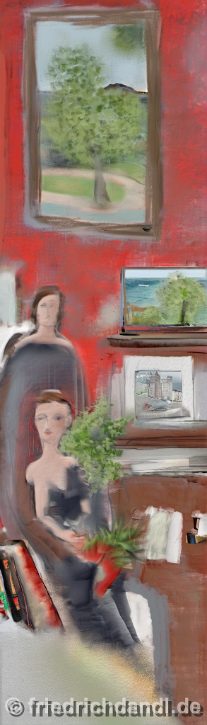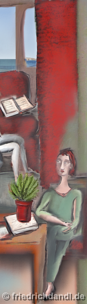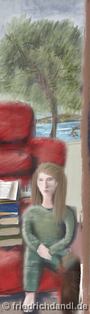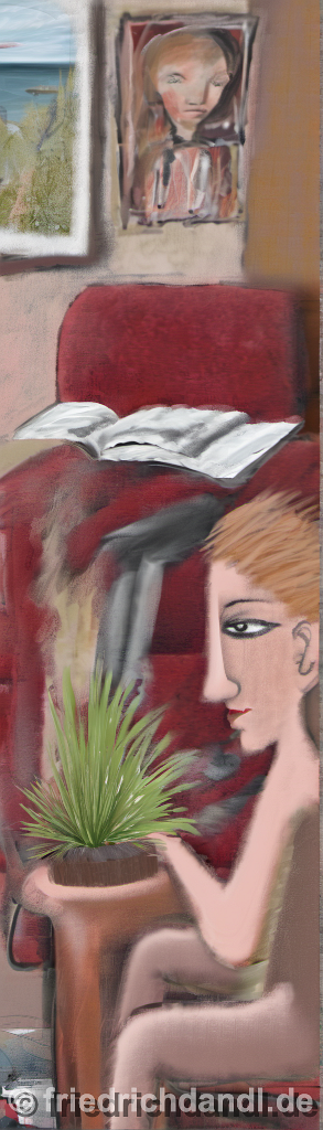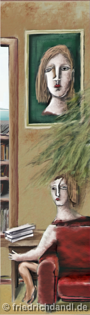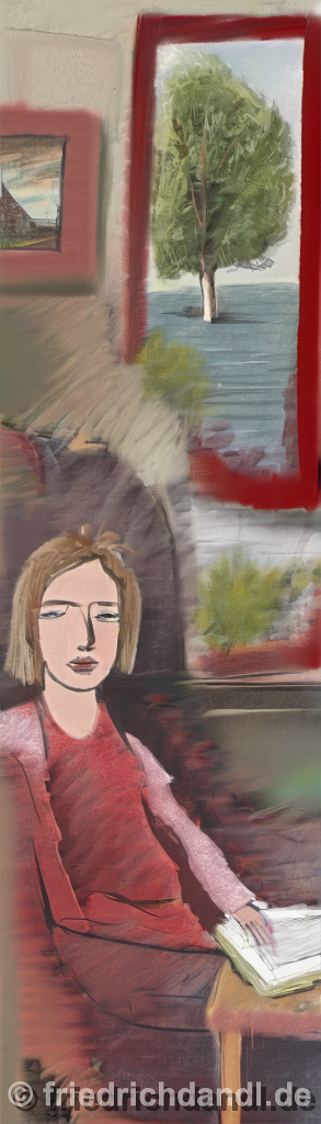 104285378-DPM++ 2M-8-girl portrait-photo in the foreground, in the background oak to buegreen, sofa, table, plant, book,window with seasight, paint