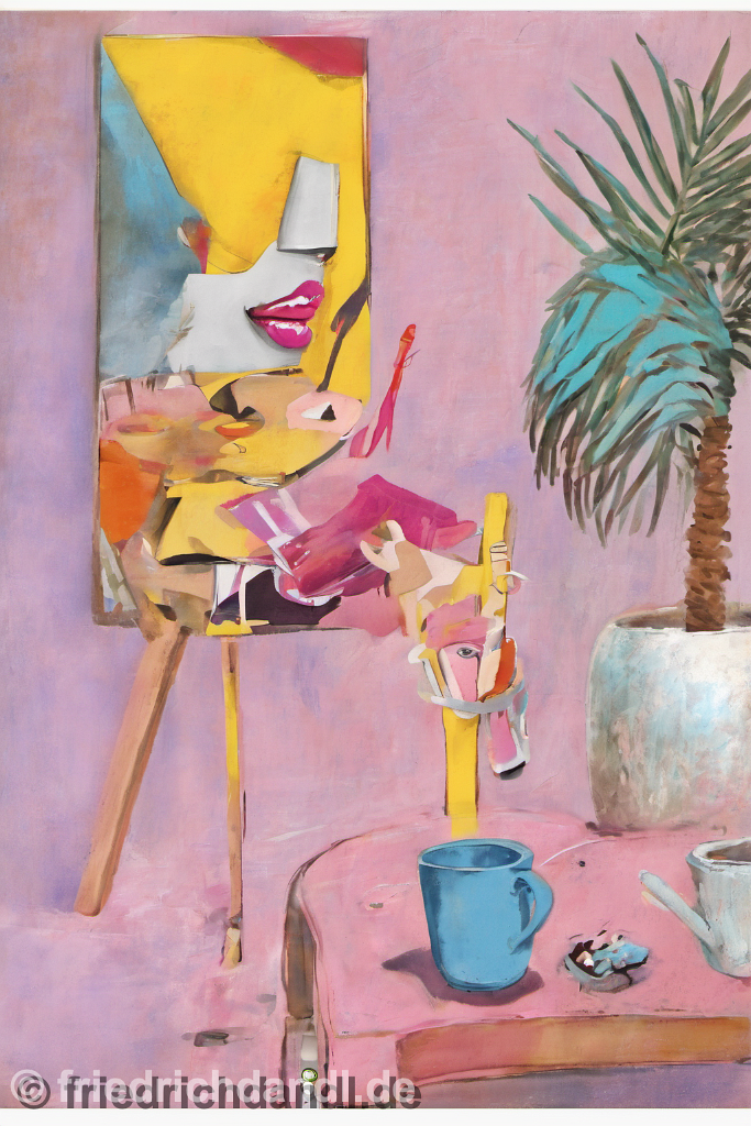 1404547801-DPM++ 2M-7-surrealistic, cup, comb, chair, nose, ear, pink, AND_pencil, brush, hand mirror, ochre, AND_tree, green_ _lora_FDandlSty2_1__