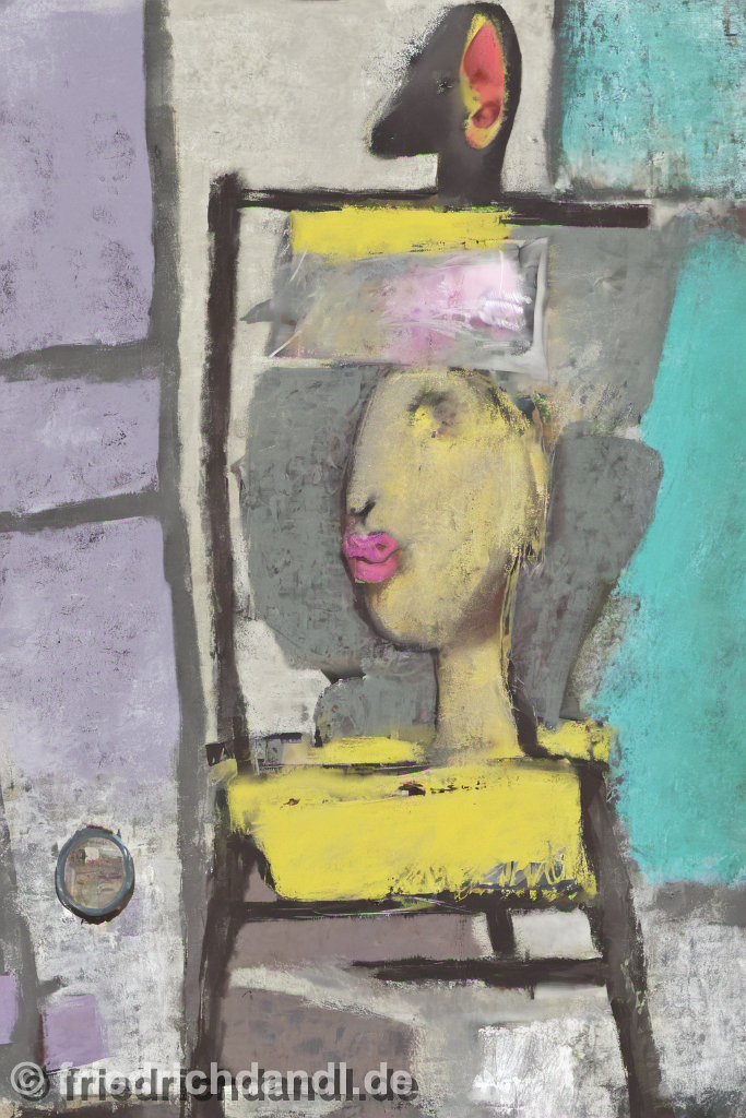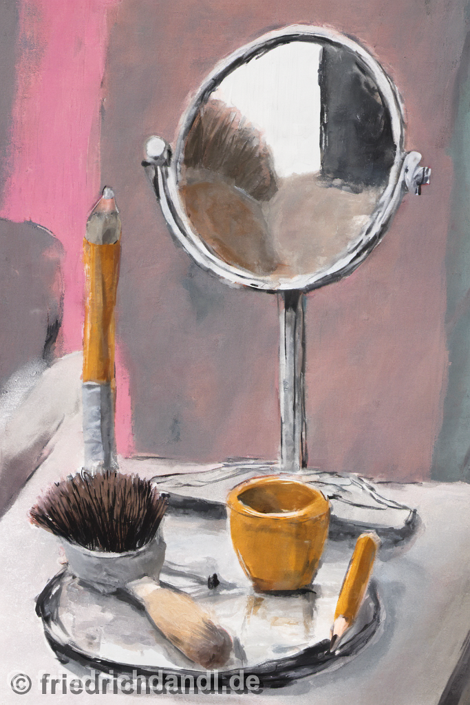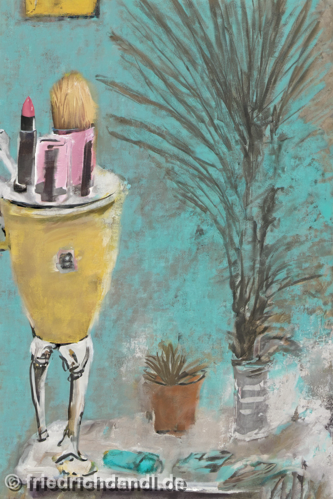 2060128373-DPM++ 2M-7-surrealistic, ochre to orange to green_pencil, brush, hand mirror, ochre, BREAK _ cup, comb, chair,lipstick, nose, ear, yellow t