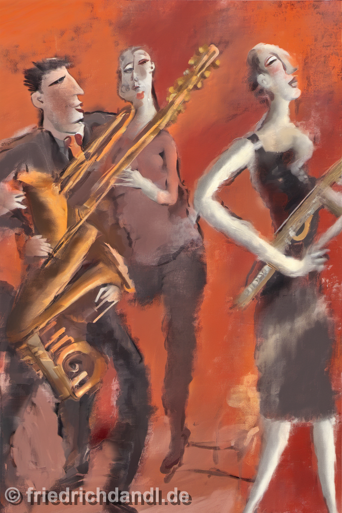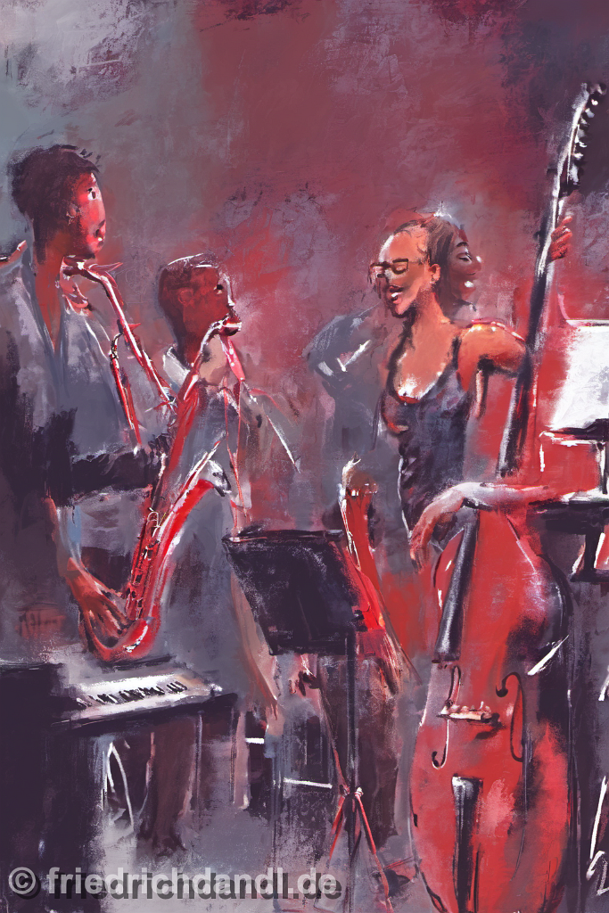 393095679-DPM++ 2M-7-jazz concert on stage, jazz-musician, drums, piano, trumpet, saxophone, boy with e-guitar, girl, red spotlight, digital paintin